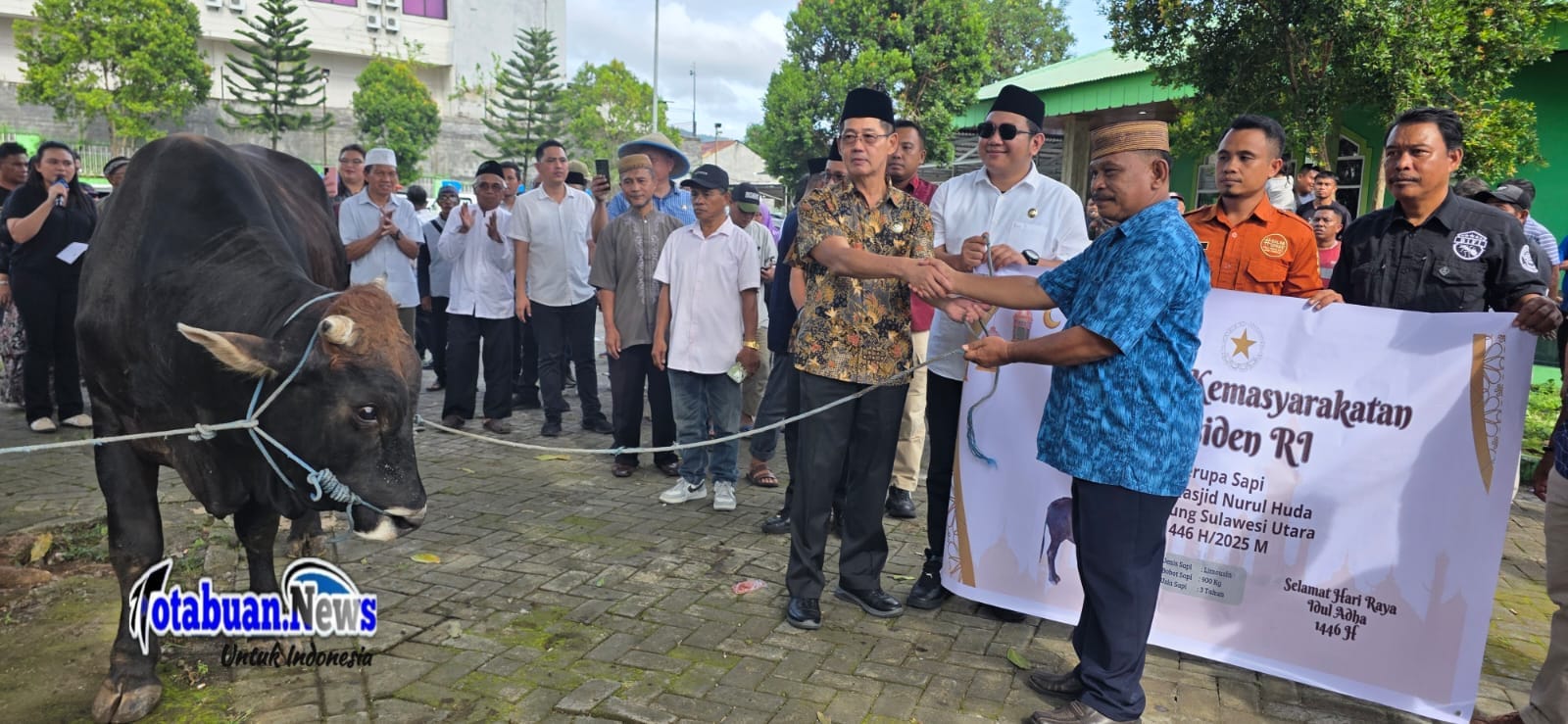 TNews, BITUNG- Wali Kota Bitung, Hengky Honandar, dan Wakil Wali Kota Bitung, Randito Maringka, menyerahkan hewan kurban bantuan Presiden Prabowo Subianto dan Pemkot Bitung di Halaman Masjid Agung Bitung Timur pada Kamis, 5/6/2025.