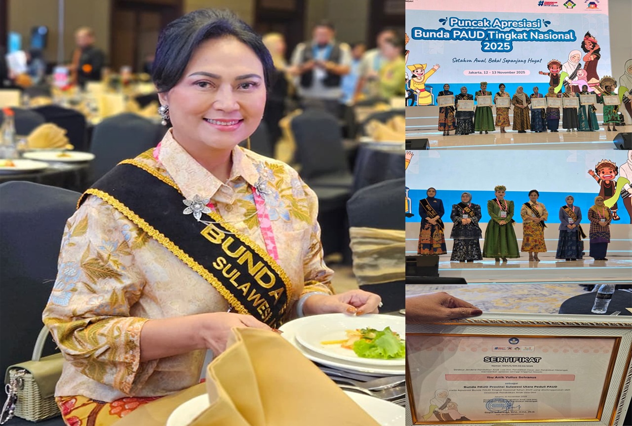 TNews, Jakarta — Prestasi membanggakan! Ny. Anik Yulius Selvanus, Bunda PAUD Provinsi Sulawesi Utara dan Ketua TP PKK Sulut, resmi menerima penghargaan nasional “Bunda PAUD Sulawesi Utara Peduli PAUD” dalam ajang Apresiasi Bunda PAUD Tingkat Nasional 2025, yang puncak digelar di The Sultan Hotel and Residence, Jakarta (13/11/2025).