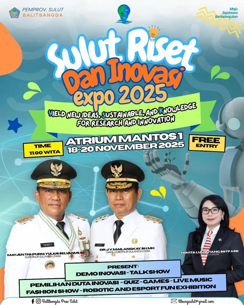 TNews, Manado Sulawesi Utara — Pemerintah Provinsi Sulawesi Utara (Pemprov Sulut) akan menggelar Sulut Riset dan Inovasi Expo 2025 pada 18–20 November 2025 di Atrium Manado Town Square (Mantos) 1. Acara ini menjadi ajang utama untuk mempromosikan konsep ekonomi biru dan ekonomi hijau sebagai fondasi pembangunan berkelanjutan di Sulut.