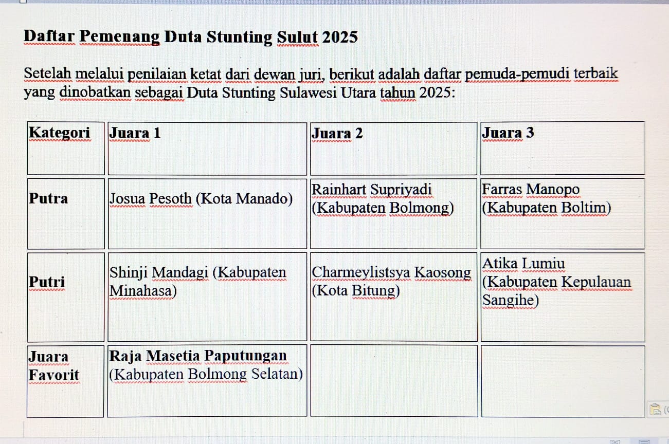 Stelah melalui penilaian ketat dari dewan juri, berikut adalah daftar pemuda-pemudi terbaik yang dinobatkan sebagai Duta Stunting Sulawesi Utara tahun 2025: