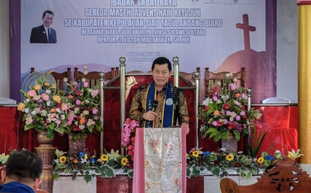 TNews, Tagulandang Sulawesi Utara – Wakil Gubernur Sulawesi Utara (Sulut), Victor Mailangkay, pada Sabtu (22/11/2025), secara resmi mewakili Gubernur Yulius Selvanus menghadiri Ibadah Sabat Raya Pertemuan Gereja Masehi Advent Hari Ketujuh (GMAHK) se-Kabupaten Kepulauan Siau Tagulandang Biaro (Sitaro). Pertemuan akbar ini diselenggarakan di Jemaat Buha, Kecamatan Tagulandang Selatan.