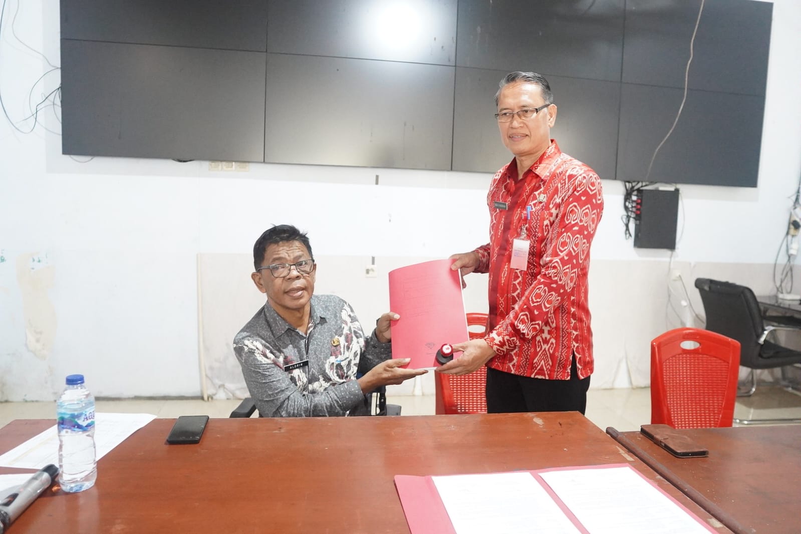 Setelah bertukar menandatangani berita acara Sertijab, kedua pejabat senior Pemkab Minut ini, kemudian saling berjabat tangan.