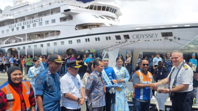 Kapal Pesiar MV Odyssey (Villa Vie Residences) Berbendera Bahamas Disambut Meriah di Pelabuhan Samudera Bitung